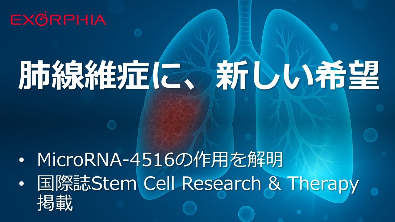 株式会社EXORPHIA(エクソーフィア、本社:東京都)は、順天堂大学医学部呼吸器内科学講座との共同研究により、当社独自製法で製造したMSC(間葉系間質細胞)由来の細胞外小胞(Extracellular Vesicles: EV)に豊富に含まれるMicroRNA-4516が肺線維症の進展を抑制する仕組みを解明しました。本成果をまとめた論文は、幹細胞・再生医療分野のトップクラスの学術誌のひとつである Stem Cell Research & Therapy に掲載されました。